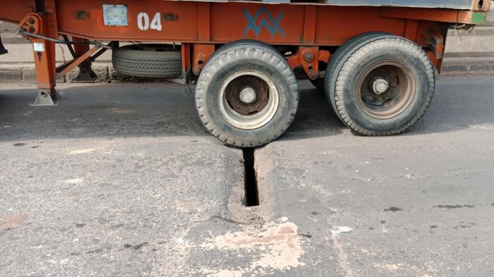 Jakarta - Kondisi jalan di Jalan Akses Marunda kian memprihatinkan. Terlihat ada renggangan di bagian tengah. Seperti apa?