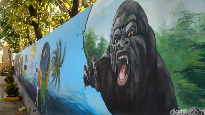 Saat ini ada dua kampung 3D di Kelurahan Kesambi, Kota Cirebon, yang disulap menjadi menarik, yakni Kampung Sidamulya Utara RW 10 dan Langensari RW 03. Gambar-gambar hewan dan tumbuhan menghiasi tembok yang berada di gerbang masuk Kampung Sidwamulya Utara RW 10. Ada gambar Gorila yang melotot, gajah, dan lainnya. (Foto: Sudirman Wamad/detikcom)
