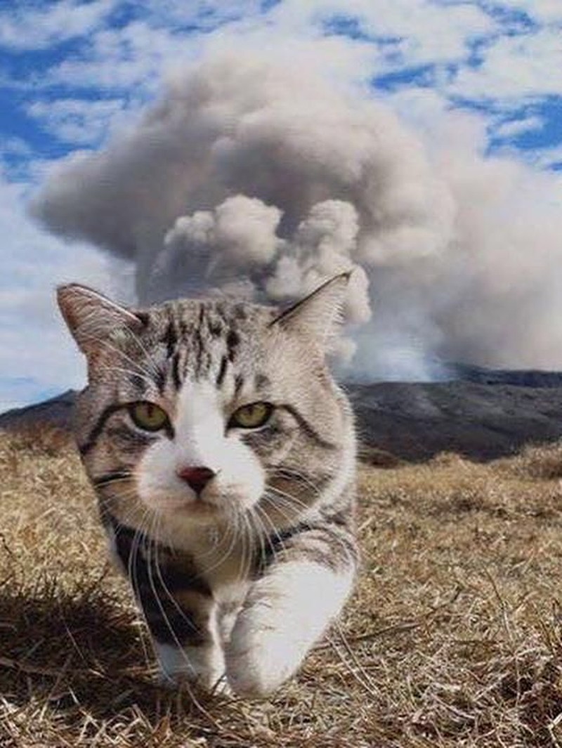 Salah satu foto kucing yang viral tersebut yakni ketika dia berada di sebuah hamparan rumput dengan latar belakang gunung yang tengah mengeluarkan abu.