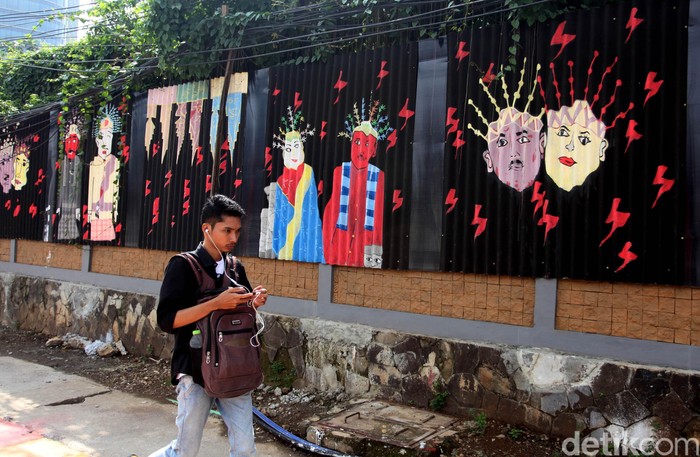 Jakarta - Ada yang berbeda di kawasan perempatan Kuningan Barat, Jakarta Selatan. Ya, seni mural bergambar Ondel-ondel semakin mempercantik trotoar.