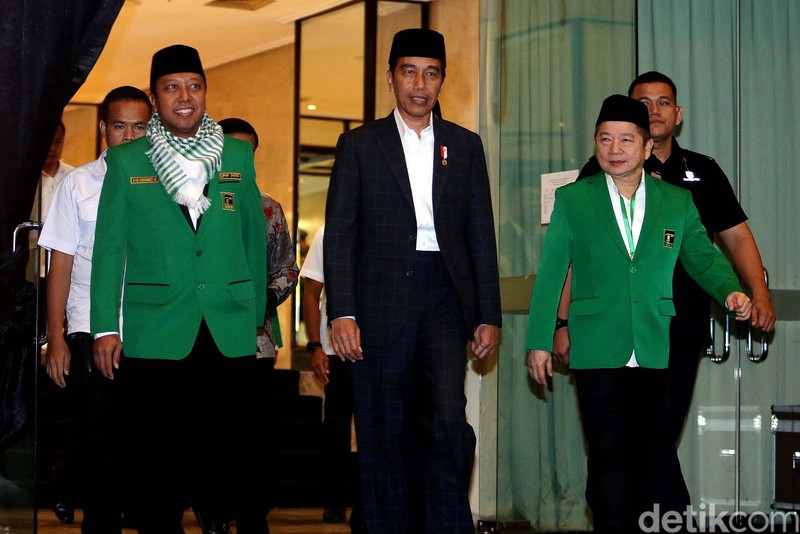 Jokowi didampingi Ketum PPP Rohahurmuziy, Menko Polhukam Wiranto, dan Menag Lukman Hakim Saifuddin.