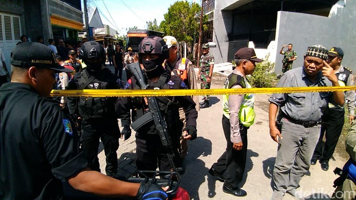 Jakarta - Rumah kontrakan Tri Murtiono, pelaku pengeboman Polrestabes Surabaya digeledah Densus 88 Anti Teror. Tim gegana dan brimob juga terlihat di lokasi.
