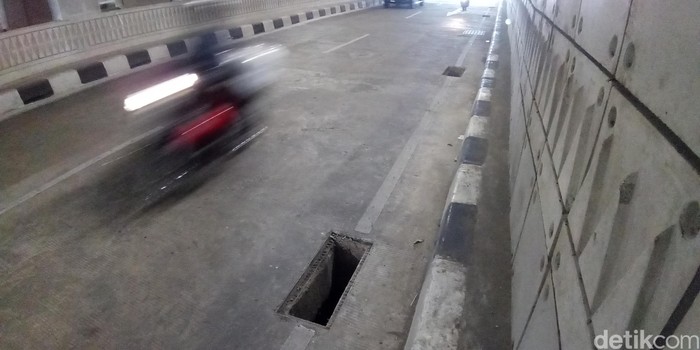 Jakarta - Tutup lubang gorong-gorong di Underpass Mampang-Kuningan raib sehingga ada beberapa lubang menganga. Begini penampakannya