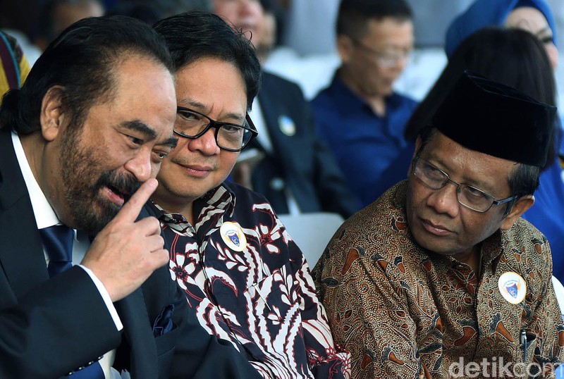 Ini momen saat Airlangga Hartarto dan Mahfud MD duduk berdampingan di acara acara kuliah umum angkatan ke-2 Akademi Bela Negara NasDem, di Jakarta, Senin (16/07/2018).