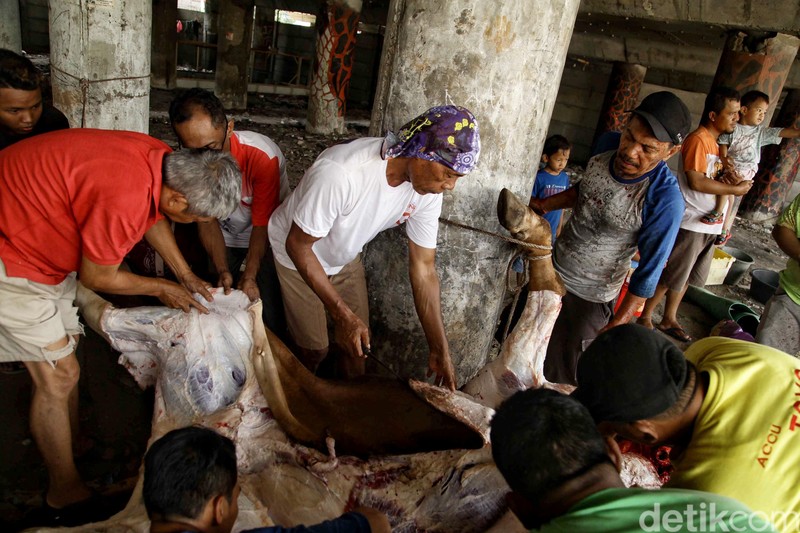 Begini Suasana Pemotongan Hewan Kurban di Warakas BAGIKAN URL telah disalin Sejumlah warga melakukan pemotongan hewan kurban di Warakas, Jakarta Timur, Rabu (22/8/2018). Usai melaksanakan Salat Idul Adha, warga melanjutkan proses pemotongan hewan kurban. Sapi dan kambing yang akan dikurbankan bersiap untuk disembelih. Beberapa ekor kambing yang akan dikurbankan. Sejumlah warga menyaksikan proses pemotongan hewan kurban. Usai disembelih hewan kurban tersebut dibersihkan untuk dibagi-bagikan dagingnya. Dua orang warga sedang menguliti kulit kambing yang telah disembelih. Nantinya, daging-daging hewan kurban ini akan dibagikan kepada masyarakat yang kurang mampu.