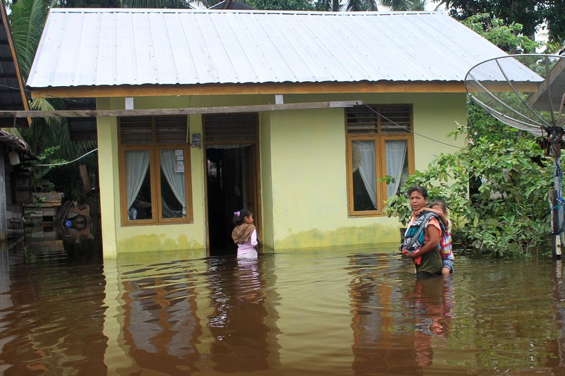 Selain daerah Aceh, beberapa daerah di Riau pun terendam banjir. Intensitas hujan yang tinggi dan bertepatan dengan musim pasang besar air laut pada seminggu terakhir membuat wilayah di pesisir Riau seperti Dumai, Rokan Hilir dan Bengkalis terendam banjir. Antara Foto/Aswaddy Hamid.