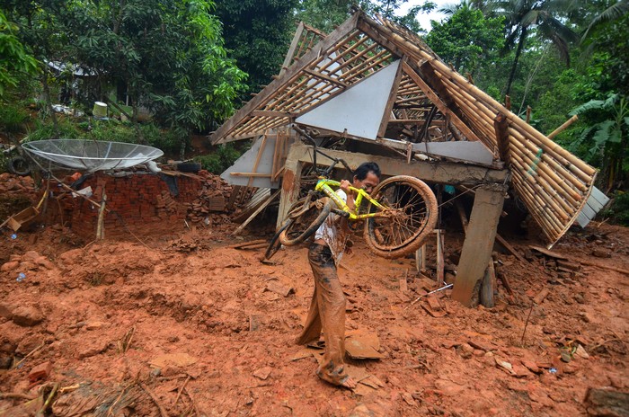 Seorang warga membawa sepeda yang masih bisa diselamatkan dari rumahnya yang tertimbun material tanah longsor di Desa Bojongsari, Tasikmalaya, Jawa Barat.