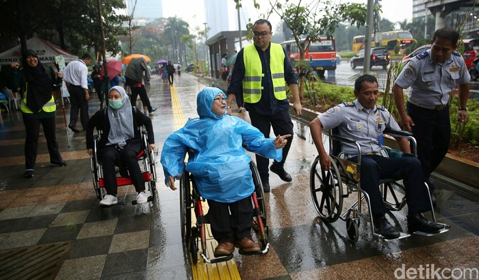 Jakarta - Warga melakukan eksperimen sosial dengan mencoba fasilitas bagi penyandang disabilitas di kawasan Sudirman, Jakarta, Senin (3/12). Begini perjuangan mereka.