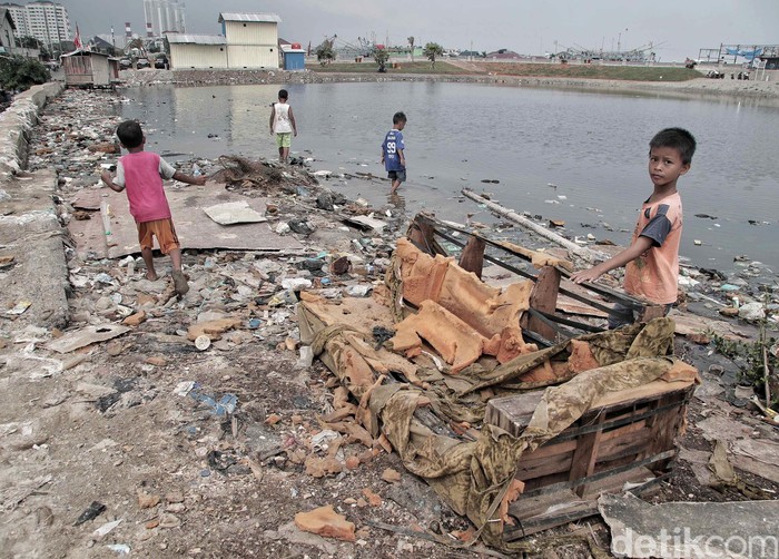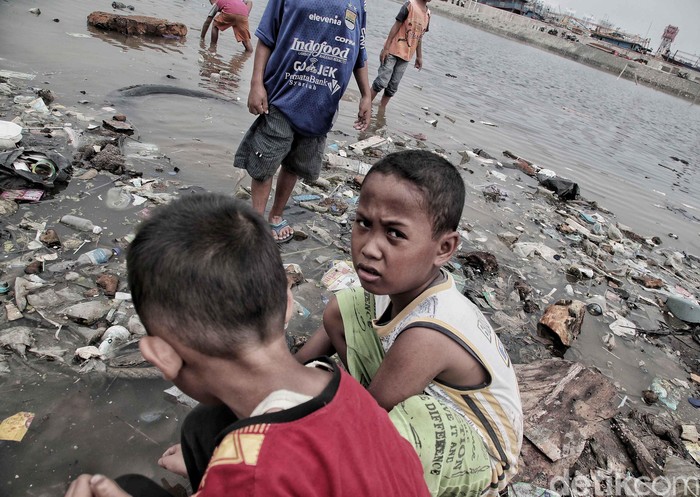Anak-anak tersebut tidak memperdulikan kesehatannya, mereka tetap asyik bermain pantai yang kotor.