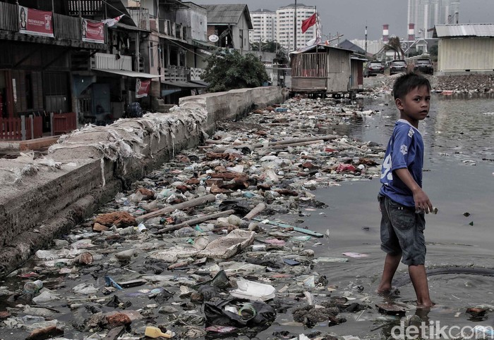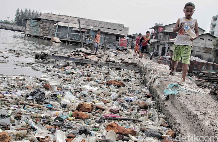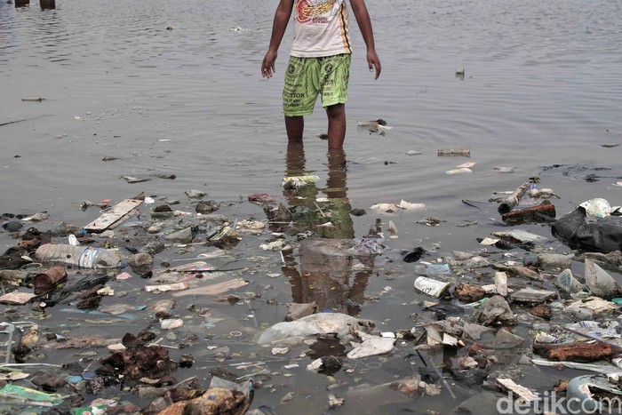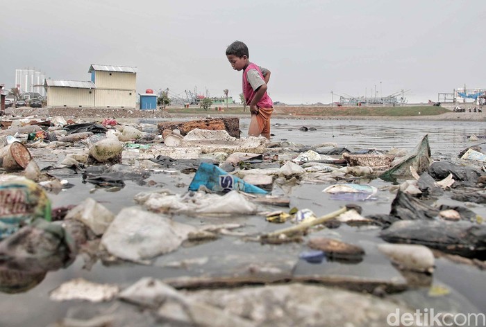 Jakarta - Pantai Muara Baru, Jakarta Utara, dipenuhi oleh sampah plastik, Senin (10/12/2018). Mirisnya pantai yang kotor itu jadi tempat bermain anak-anak.