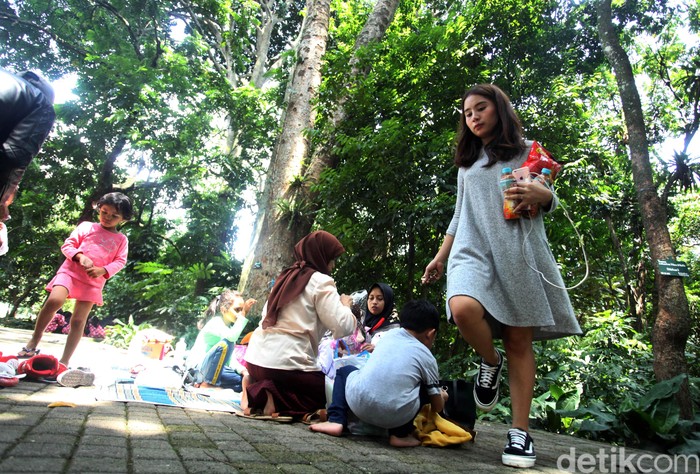 Sejumlah keluarga nampak duduk-duduk dan menikmati suasana asri dan rindang di area sekitar Kebun Raya Bogor.