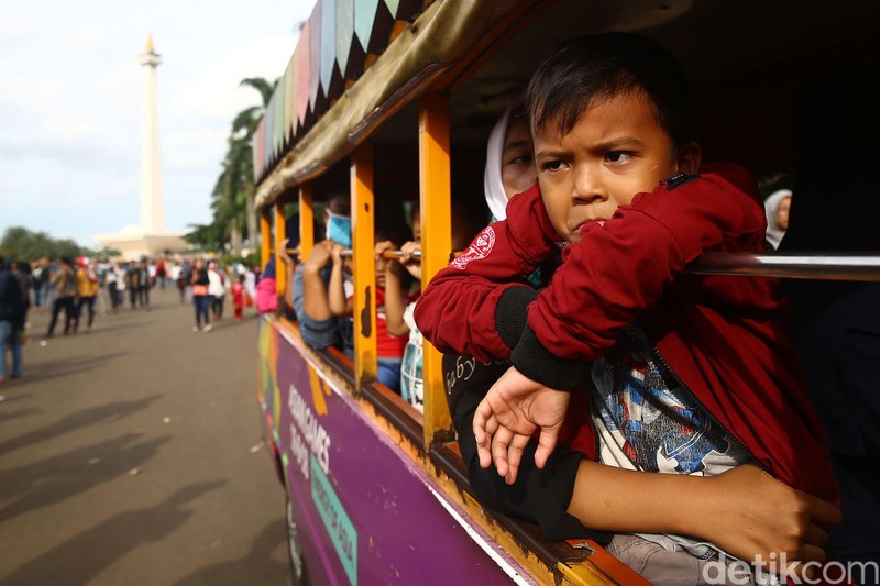 Hingga Sore Hari Monas Masih Ramai Pengunjung BAGIKAN URL telah disalin Pengunjung berkeliling Monas dengan kereta wisata. Pengunjung memadati kawasan Monas, Jakarta, Selasa (1/1/2018). Masih dalam rangka libur tahun baru dan akhir tahun, obyek wisata Monas masih menjadi daya pikat masyarakat Indonesia. Mereka berlibur bersama keluarga. Pengunjung bersantai di taman Monas. Kereta wisata ramai konsumen. Anak-anak tampak gembira berwisata di Monas. Seorang ayah menggendong anaknya.