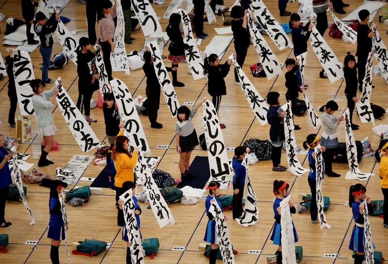 Serunya Anak-anak Ikuti Kontes Kaligrafi di Jepang BAGIKAN URL telah disalin Ratusan peserta yang terdiri dari anak-anak tampak memamerkan hasil kaligrafi di kontes tahunan tersebut. REUTERS/Kim Kyung-Hoon. Anak-anak terlihat sangat teliti dan antusias mengikuti kontes. REUTERS/Kim Kyung-Hoon. Media yang digunakan juga sangat kental dengan nuansa tradisional khas Jepang. REUTERS/Kim Kyung-Hoon. Kontes tersebut digelar di Tokyo, Jepang, Sabtu (5/1/2019) waktu setempat. REUTERS/Kim Kyung-Hoon. Usai kontes, para peserta memamerkan hasil goresan tinta yang dibuatnya. REUTERS/Kim Kyung-Hoon.