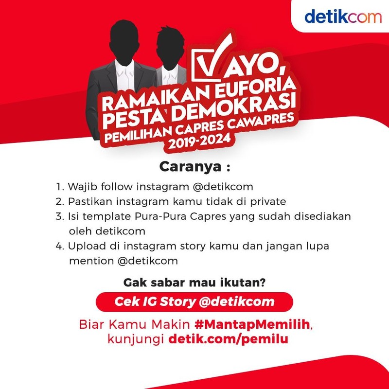 Program 'Pura-pura Capres' ini adalah bagian dari campaign #MantapMemilih detikcom yang digelar sejak 1 Februari lalu hingga 15 Februari nanti. Gimana cara ikutnya? 1. Wajib follow Instagram @detikcom 2. Pastikan Instagram kamu tidak di-private 3. Isi template Pura-pura Capres yang sudah disediakan oleh detikcom (cek IG Story @detikcom ya!) Kamu bisa isi program kerja hingga slogan kampanye sekreatif mingkin 4. Upload di Instagram story kamu dan jangan lupa mention detikcom
