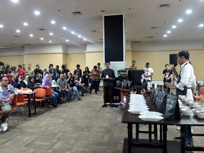Dalam kesempatan tersebut, Jokowi meninjau sejumlah kelas yang diadakan. Di salah satu kelas, yakni kelas kopi, Jokowi bahkan turut serta sebagai peserta. (Foto: Biro Pers Setpres)