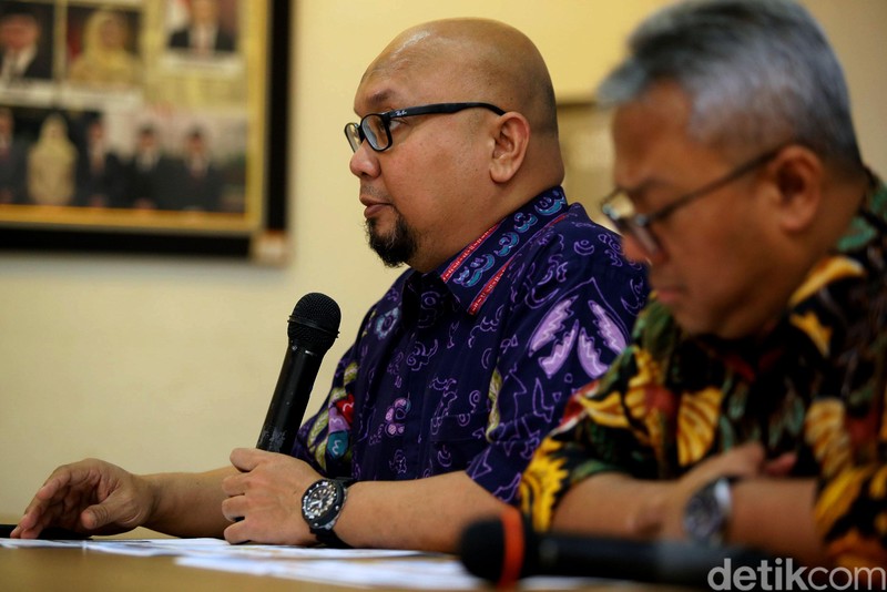 Ketua KPU Arief Budiman bersama Komisioner KPU Ilham Saputra mengumumkan 32 nama baru caleg es koruptor yang kembali maju dalam kontestasi Pemilu 2019 mendatang di Media Center KPU, Jakarta, Rabu, (19/2/2019).