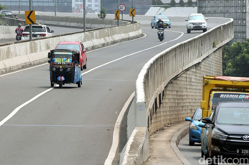 Gaspol! Bajaj dan Pemotor Nekat Terobos JLNT Kasablanka BAGIKAN URL telah disalin Penampakan bajaj yang nekat melintasi JLNT Kasablanka, Jakarta, Selasa (19/2/2019). Meski dilarang, baja dan pemotor seakan tidak kapok. Pengawasan aparat petugas di jalan layang non tol (JLNT) Kampung Melayu-Tanah Abang atau Casablanca, kini semakiin hilang. Padahal, terlihat jelas ada rambu lalu lintas yang melarang pengendara sepeda motor untuk naik JLNT tersebut. Bagaimana menurut Anda soal bajaj dan pemotor yang masih saja nekat menerobos JLNT?