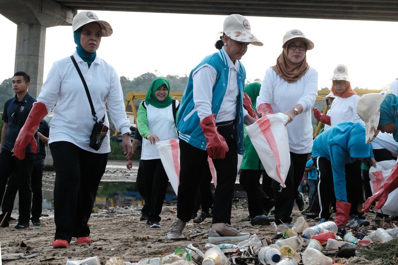 Iriana Jokowi memimpin aksi bersih-bersih pantai di kawasan Hative Kecil, Kota Ambon, Rabu (20/2/2019). Antara Foto/Atika Fauziyyah