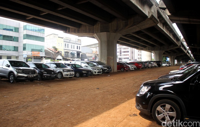 Sejumlah kendaraan nampak terparkir di bawah kolong tol layang di dekat stasiun MRT Fatmawati, Jakarta, Kamis (4/4/2019).