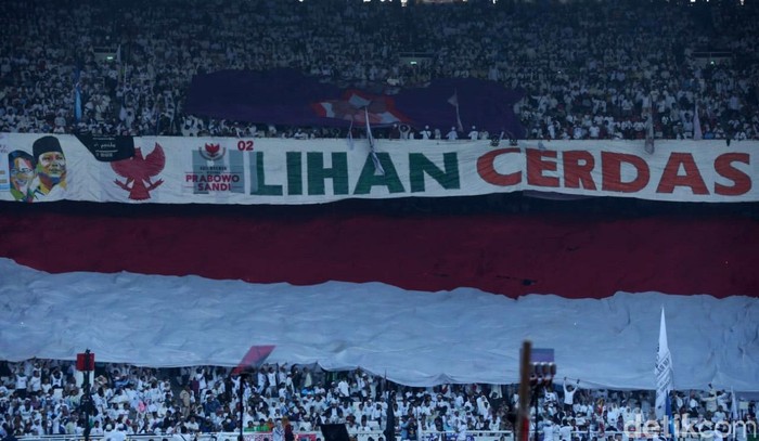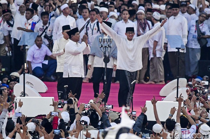 Jakarta - Pasangan capres-cawapres Prabowo dan Sandiaga menyapa pendukung yang hadir di kampanye akbar. Mereka menyapa dengan memberi salam dan melambaikan tangan.