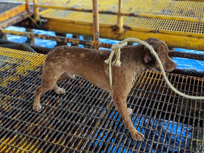 Anjing betina itu pun tinggal sementara di sebuah kandang khusus yang telah disediakan di tempat pengeboran minyak tersebut. Para pekerja memberi anjing tersebut makanan dan air. Facebook/Vitisak Payalaw/via Reuters.