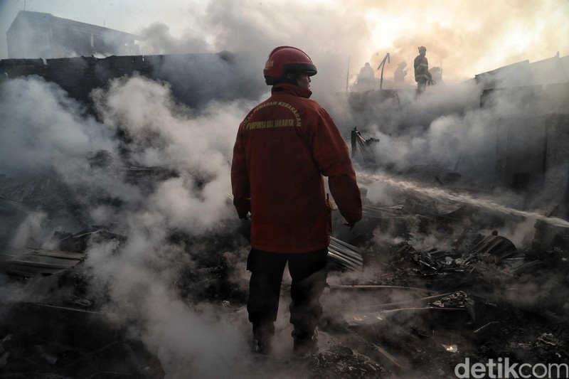 Melihat Sang Pemburu Api Beraksi di Warakas BAGIKAN URL telah disalin Petugas pemadam kebakaran tengah melakukan pendinginan. Kebakaran terjadi di Jalan Warakas 2, Jakarta Utara, Kamis (25/7/2019) sekitar pukul 05.00 WIB. 10 Unit mobil kebakaran dikerahkan untuk memadamkan api. Begini perjuangan para petugas pemburu api. Warga ikut membantu proses pemadaman api. Warga naik ke atap rumah untuk menyiramkan air. Sejumlah petugas pemadam kebakaran berusaha memadamkan api di kawasan Warakas, Jakarta Utara, Kamis (25/7). Asap putih mengepul dari rumah yang terbakar. Kebakaran ini terjadi di pemukiman padat penduduk. Warga berusaha mengevakuasi barang-barang yang masih bisa diselamatkan. Rumah warga tinggal rangka. Penyebab kebakaran ini masih diselidiki. Rumah yang padat dan berdempetan menyebabkan api cepat menjalar. Tidak ada korban jiwa dalam insiden ini.