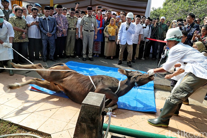 Anies Lepas Petugas Pemeriksa Hewan Kurban di Jakut BAGIKAN URL telah disalin Gubernur DKI Jakarta Anies Baswedan saat hadiri acara Pelepasan Petugas Kesehatan Hewan Kurban. Acara pelepasan tersebut digelar di kawasan Jakarta Islamic Center, Jakarta, Selasa (30/7/2019). Anies memberikan sertifikat kelayakan kepada para Penyembelih hewan dan para petugas kesehatan hewan kurban. Anies juga menghimbau kepada warga untuk menggunakan besek bambu sebagai ganti plastik guna wadah daging. Sejumlah petugas bersiap menyembelih seekor sapi. Penyembelihan disaksikan langsung oleh Anies. Per 1 Agustus 2019, petugas pemeriksa hewan akan memeriksa hewan kurban di Jakarta. Petugas melalukan penyembelihan. Terlihat para petugas mengenakan peralatan yang lengkap saat menyembelih hewan. Mereka bahkan mengenakan helm, masker, sarung tangan dan celemek.