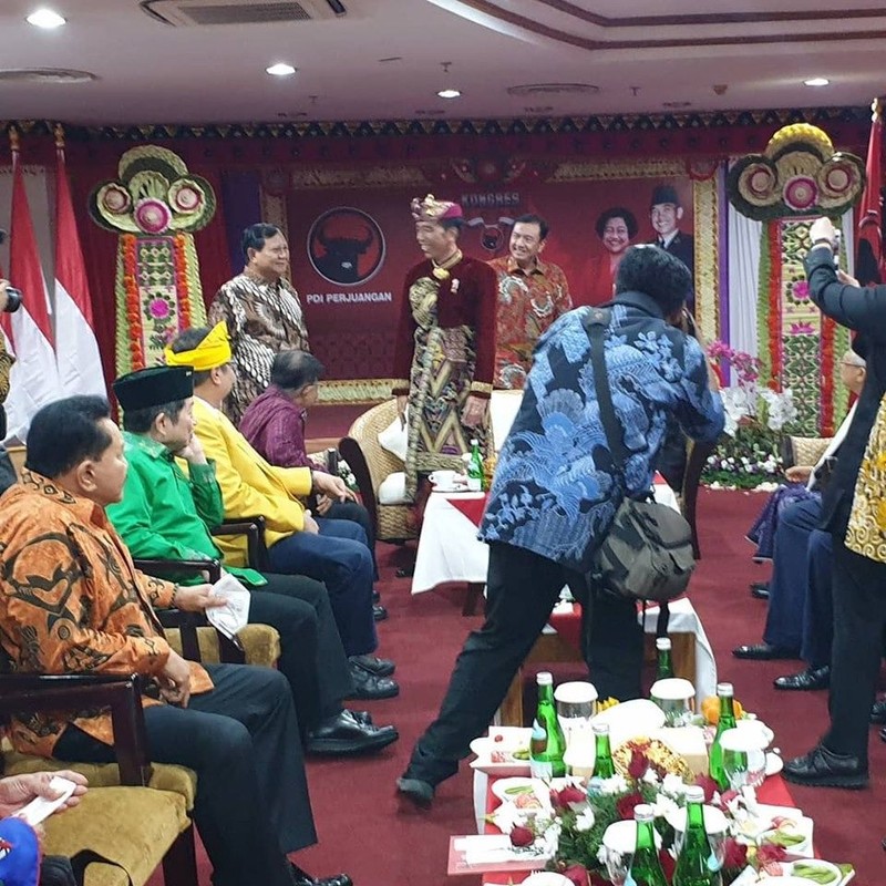 Prabowo ikut hadir di tengah-tengah koalisi Jokowi di Kongres V PDIP, Kamis (08/08) kemarin. Ketua DPP PDIP nonaktif, Puan Maharani, menyebut Prabowo 'transit' sebelum menuju panggung kongres. "Ngobrollah, dan ya namanya lagi mau menunggu momen masuk ke tempat acara. Ngobrol macem-macem," ujar Puan. Foto: dok. Diaz Hendropriyono/FB