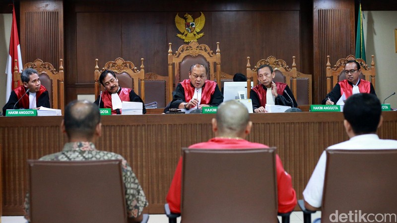 Terdakwa kasus dugaan suap dana hibah Kementerian Pemuda dan Olahraga kepada KONI, Mulyana (baju batik), Pejabat Pembuat Komitmen (PPK) Kemenpora Adhi Purnomo (jaket merah) dan Staf Kemenpora Eko Triyanto (baju putih) mengikuti sidang pembacaan tuntutan di Pengadilan Tipikor, Jakarta, Kamis (15/8/2019).