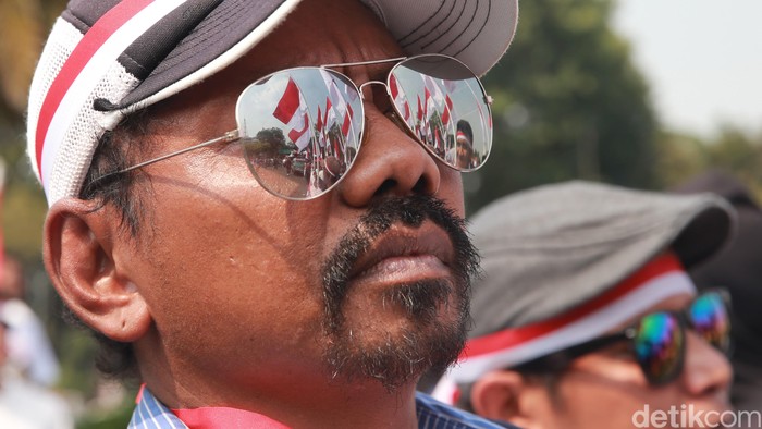 Massa juga kompak memakai ikat kepala merah putih dalam aksi damai tersebut.