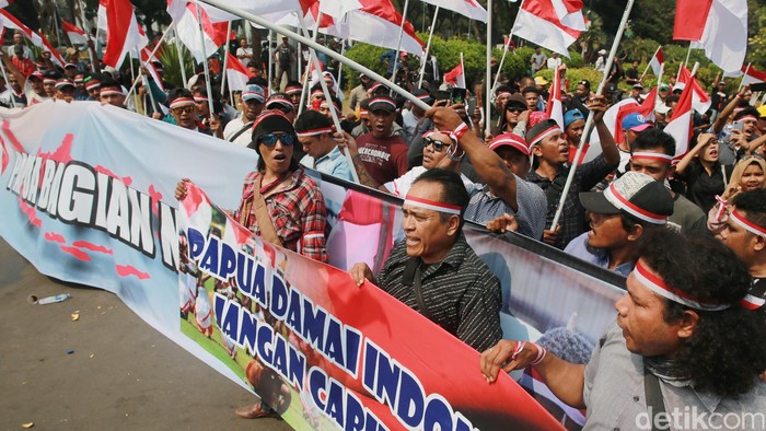 Jakarta - Massa Lintas Pergerakan Aktivis Timur dan Melanesia menggelar aksi di Taman Pandang Istana, Jakarta. Mereka mendukung Papua tetap menjadi bagian dari NKRI.