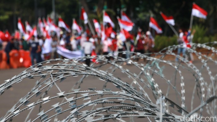Aksi ini dilakukan di depan kawat berduri yang dipasang di depan Istana.