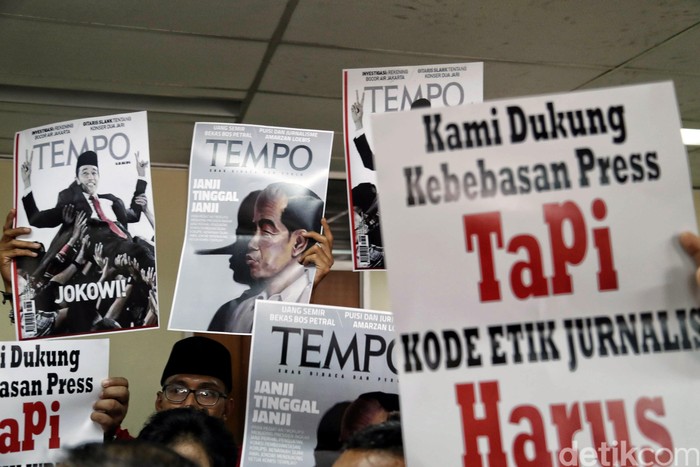 Sejumlah relawan Jokowi Mania (JoMan) melaporkan Majalah Tempo ke Dewan Pers. Alasannya, cover Majalah Tempo dinilai menghina Presiden Joko Widodo (Jokowi) karena menggambarkan Jokowi seperti tokoh fiksi 'Pinokio', Jakarta, Senin (16/9/2019).
