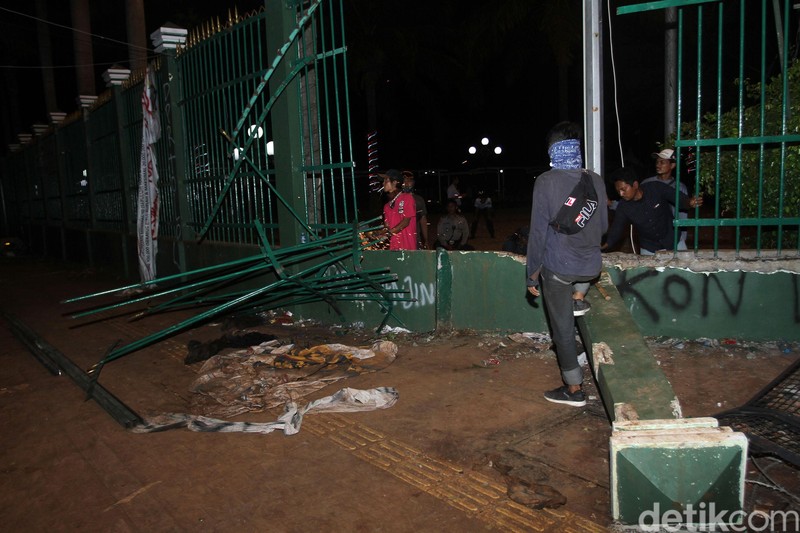 Pagar Gedung DPR yang Jebol Langsung Diperbaiki BAGIKAN URL telah disalin Petugas memperbaiki pagar gedung DPR yang rusak. Usai bentrokan yang terjadi, gepan gedung DPR terlihat dipenuhi vandalisme. Tak menunggu besok, petugas pun langsung membersihkan. Vandalisme yang terlihat di depan gedung DPR langsung dihapus menggunakan tinner. Petugas membersihkan coretan yang dibuat mahasiswa siang tadi.