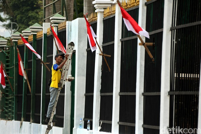 Jakarta - Gedung DPR RI, Jakarta, Senin (15/10/2019) bersolek , jelang pelantkan Presiden dan Wakil Presiden pada tanggal 20 Oktober nanti. Pagar gedung DPR dicat ulang.