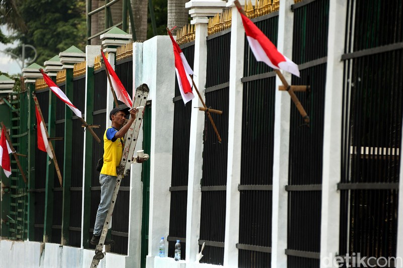 Jelang Pelantikan Presiden, Gedung DPR Bersolek BAGIKAN URL telah disalin Pekerja mengecat pagar gedung DPR. Gedung DPR RI, Jakarta, Senin (15/10/2019) bersolek , jelang pelantkan Presiden dan Wakil Presiden pada tanggal 20 Oktober nanti. Salah satunya mempercantik pagar di depan pintu masuk yang berada di Jalan Gelora maupun pintu masuk di depan Jalan Gatot Subroto. Pagar besi dicat warna hitam sementara temboknya dipoles warna putih. Para pekerja tengah mengecat pagar gedung DPR.