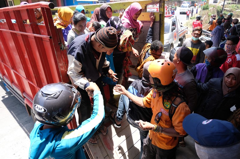 Sejumlah warga mengungsi dengan menumpang truk akibat angin kencang yang menerjang kawasan kaki Gunung Merbabu, Desa Ketundan, Pakis, Magelang, Jawa Tengah, Senin (21/10/2019).