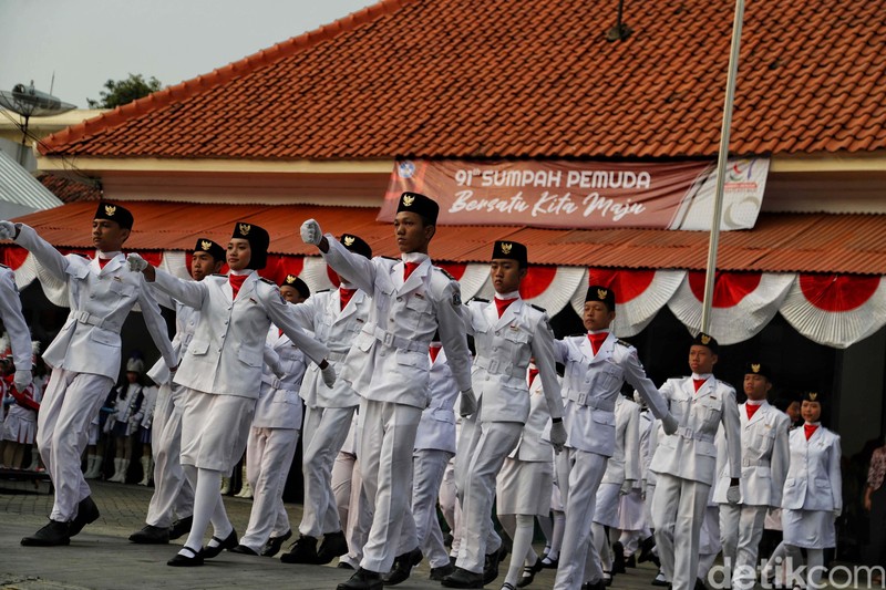 Suasana Upacara Hari Sumpah Pemuda di Jalan Raya BAGIKAN URL telah disalin Upacara Hari Sumpah Pemuda ini berlangsung di Museum Sumpah Pemuda, Jakarta, Senin (28/10). Upacara ini mengambil setengah dari badan jalan Salemba. Kemacetan panjang pun terjadi. Petugas berusaha mengatur arus lalu lintas. Upacara tersebut diikuti oleh para pelajar, KNPI serta PNS. Upacara berjalan khitmad. Drumband yang dimainkan oleh anak-anak meramaikan upacara ini. Mereka menyanyikan lagu-lagu nasional. Para pelajar tampak terharu mengenang perjuangan para pemuda dalam merebut kemerdekaan. Penyematan pin kepada pasukan pengibar bendera.
