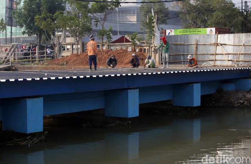 Seorang pekerja sedang sibuk menyelesaikan pembangunan jembatan yang dibangun di atas aliran Sungai Kalimalang tersebut.