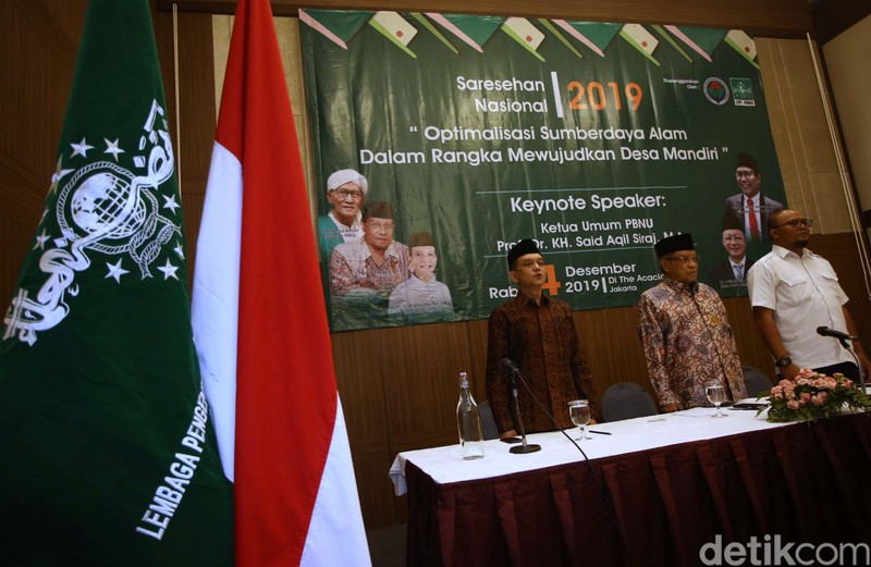 Ketua Pengembangan Pertanian PBNU Al Amin Nur, Ketua Umum PBNU KH Said Aqil Siradj dan Budi Prabowo staf khusus dirjen PPMD Kemendes RI saat diskusi Sarasehan Nasional di Jakarta, Rabu (4/12/2019).