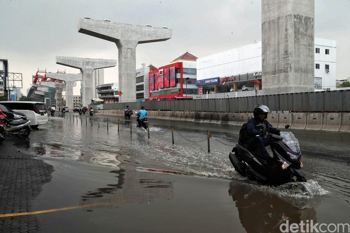 Hujan yang mengguyur sejumlah wilayah di Jakarta semalam membuat sejumlah jalan tergenang air, salah satunya jalan di kawasan Boulevard Kelapa Gading.