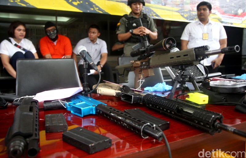 Terlihat sejumlah barang bukti dipajang di meja panjang. Terlihat ada 4 senjata laras panjang, 6 pucuk senjata laras pendek.