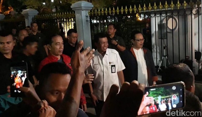 Jokowi lalu berjalan ke arah selatan Gedung Agung. Tak lama, Jokowi kembali berjalan ke arah utara sembari membagikan kaus berwarna hitam bergambar wajahnya.