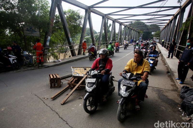 Jembatan Kali Bekasi Alami Pergeseran Akibat Luapan Sungai BAGIKAN URL telah disalin Begini kondisi terkini Jembatan Kali Bekasi yang mengalami pergeseran, Jumat (3/1/2020). Petugas Dinas Bina Marga langsung melakukan pengecekan. Jembatan tersebut terletak di Jalan Teluk buyung. Pergeseran jembatan membuat kendaraan roda empat dilarang melintas. Hanya sepeda motor yang diperbolehkan melintas. Jembatan tersebut menghubungkan kawasan Bekasi Utara dengan Bekasi Timur.