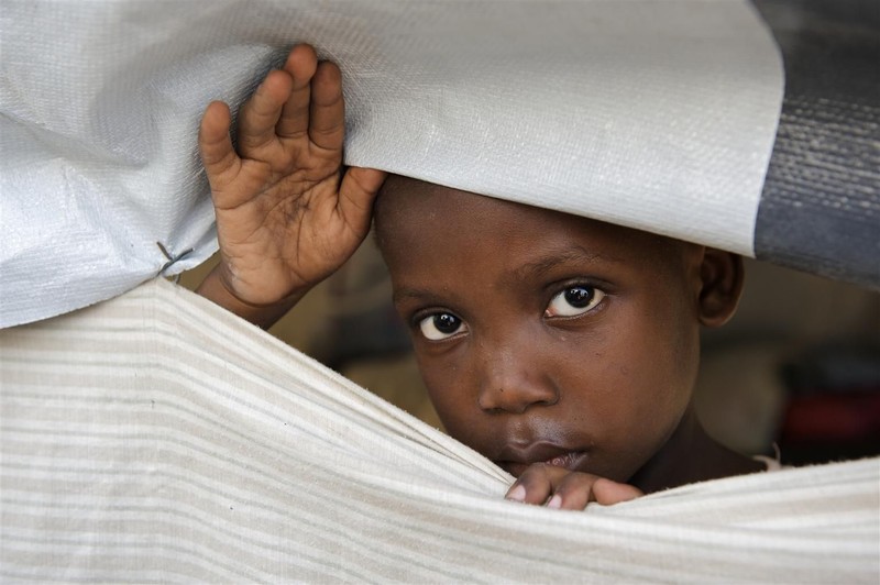Februari 2010, seorang bocah mengintip dari sela terpal disalah satu kamp pengungsian di ibu kota Port-au-Prince. Tiga juta orang atau sekitar sepertiga dari populasi Haiti secara langsung terkena dampak gempa dahsyat pada 2010 lalu. Istimewa/UNICEF/Noorani.