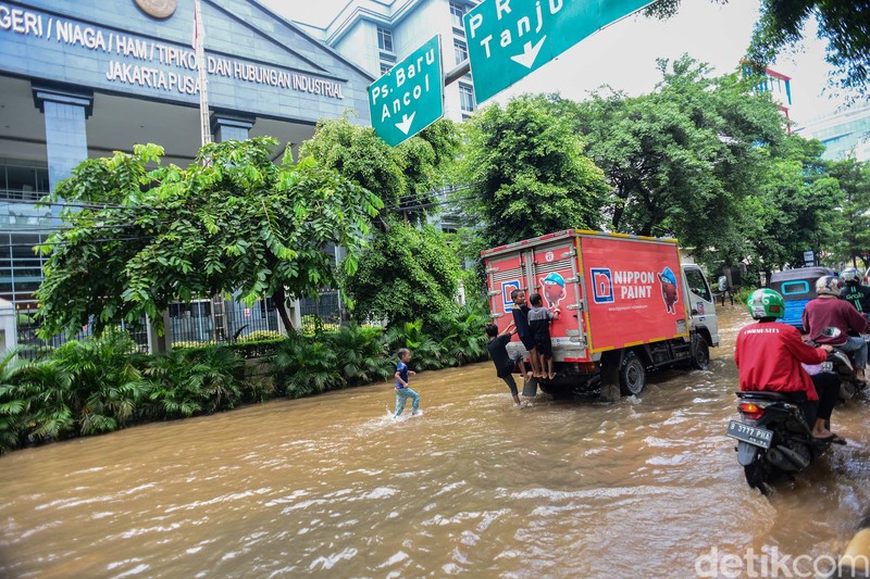 Genangan justru dijadikan sebagai tempat bermain oleh anak-anak.
