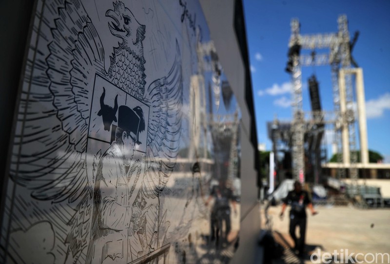 Suasana di Lapangan Banteng tampak sibuk dengan aktivitas sejumlah pekerja yang tengah mempersiapkan panggung untuk gelaran acara konser musik, Jakarta, Selasa (10/3/2020).