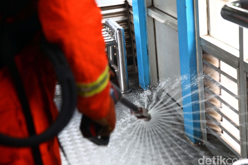 Cegah Corona, Halte Pejaten Disemprot Disinfektan BAGIKAN URL telah disalin Petugas menyemprotkan disinfektan di halte Busway Pejaten, Jalan Raya Buncit, Jakarta Selatan, Senin (16/3/2020). Petugas PPSU juga dikerahkan untuk membersihkan halte. Setiap sudut halte disemprot. Aktivitas ini tidak mengganggu pelayanan TransJ. Penyemprotan disinfektan dilakukan sebagai upaya cegah penyebaran corona. Anggota TNI ikut memantau proses penyemprotan disinfektan.