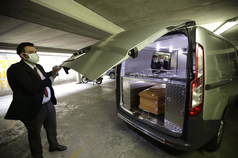 Pemakaman yang terjadi di Italia utara belum pernah terjadi sebelumnya, yakni berlangsung dengan sangat cepat dan tidak adanya pelayat. Daftar pemakaman masih panjang, dan menurut hukum Italia orang masih tidak boleh bertemu. Cliff Walker Jr./Arrington Funeral Directors via AP.