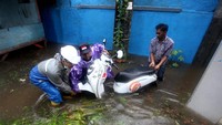 Ketua DPRK Banda Aceh Farid Nyak Umar membantu mengangkat sepeda motor milik warga yang terjebak banjir di Desa Beurawe, Banda Aceh, Aceh, Jumat (8/5/2020).